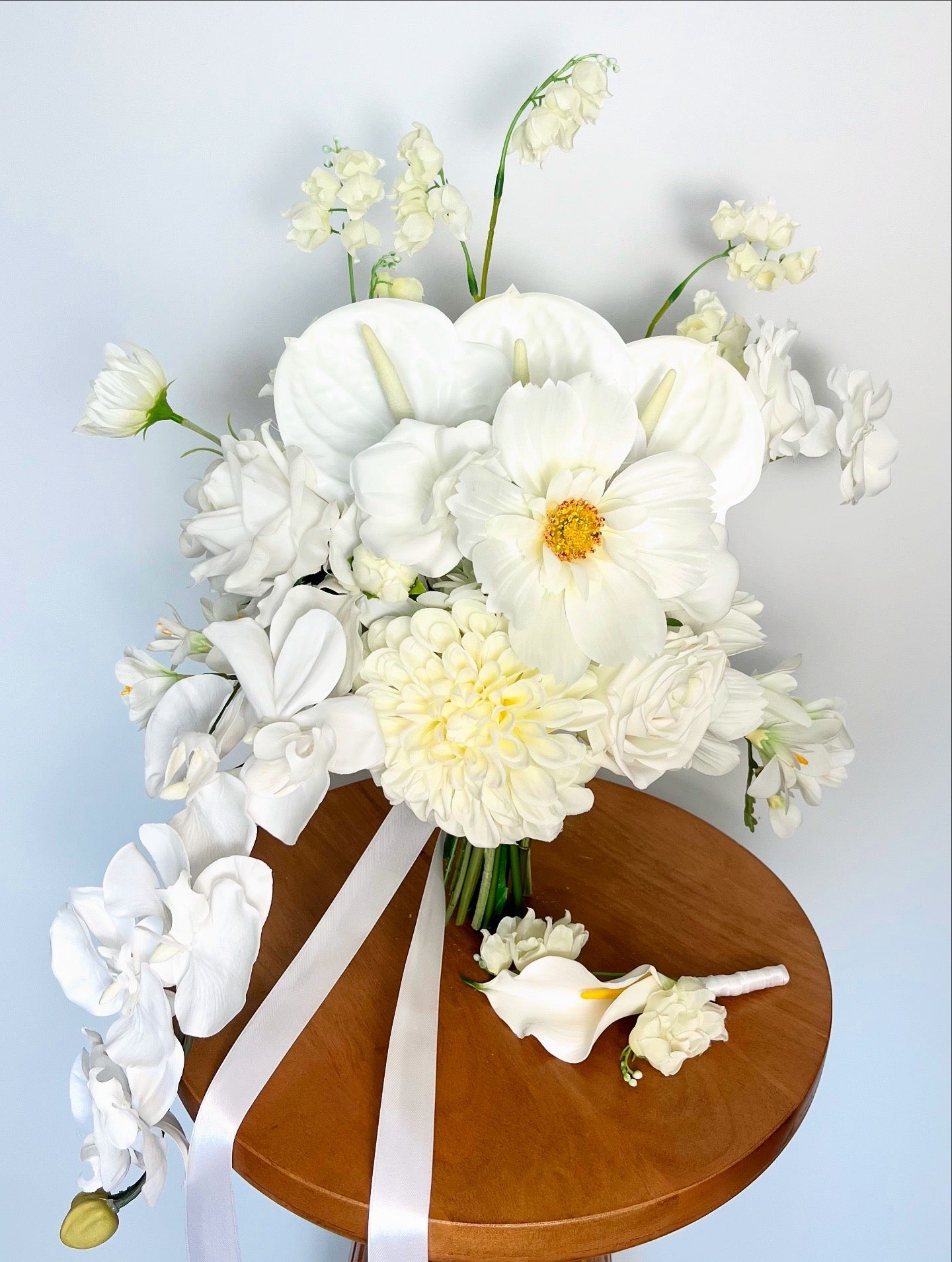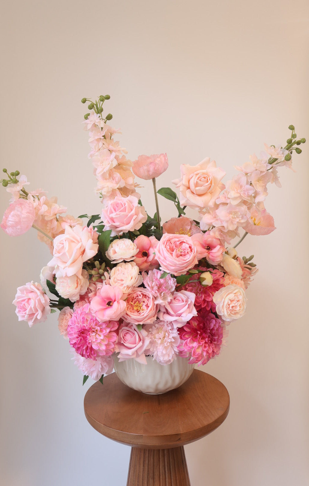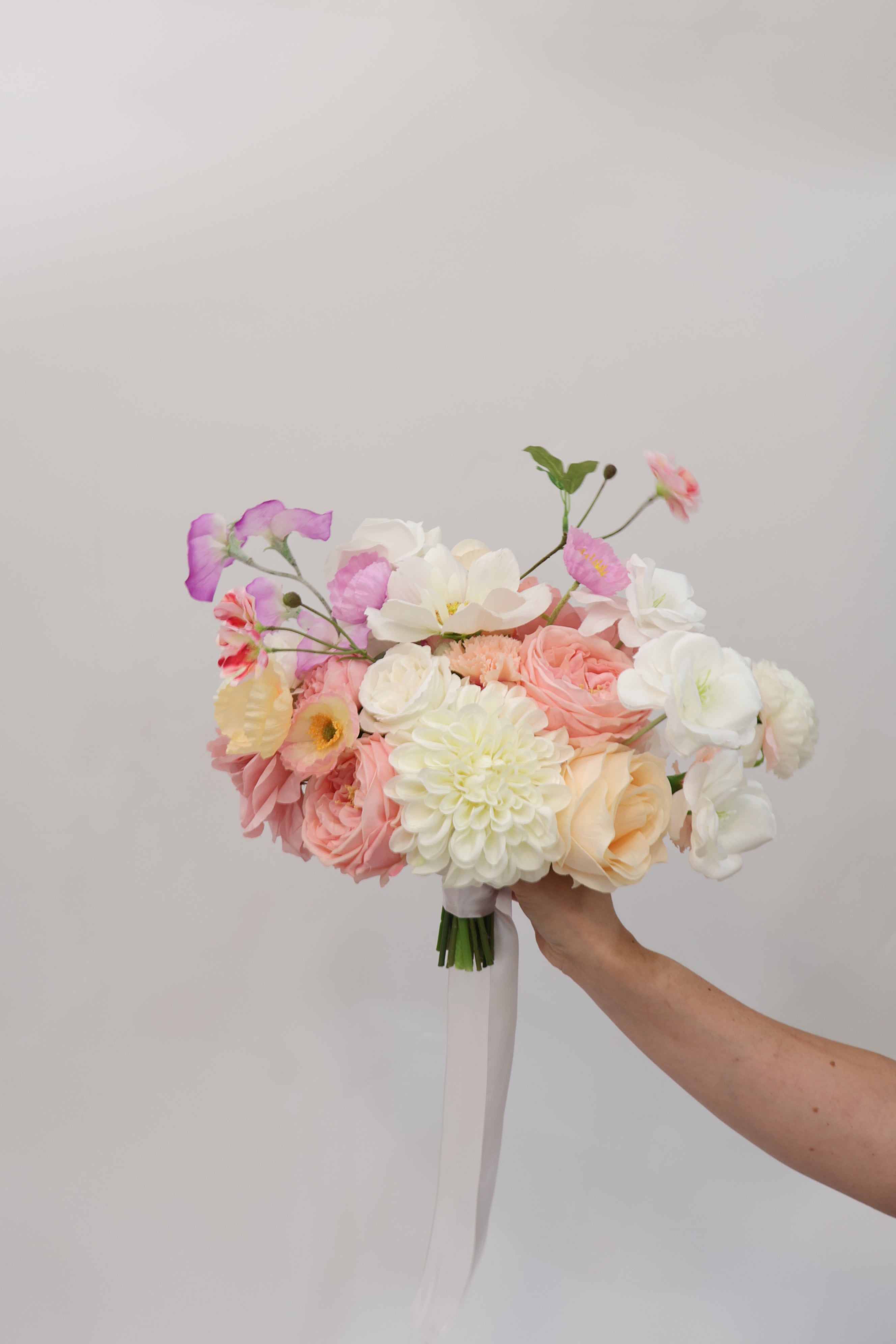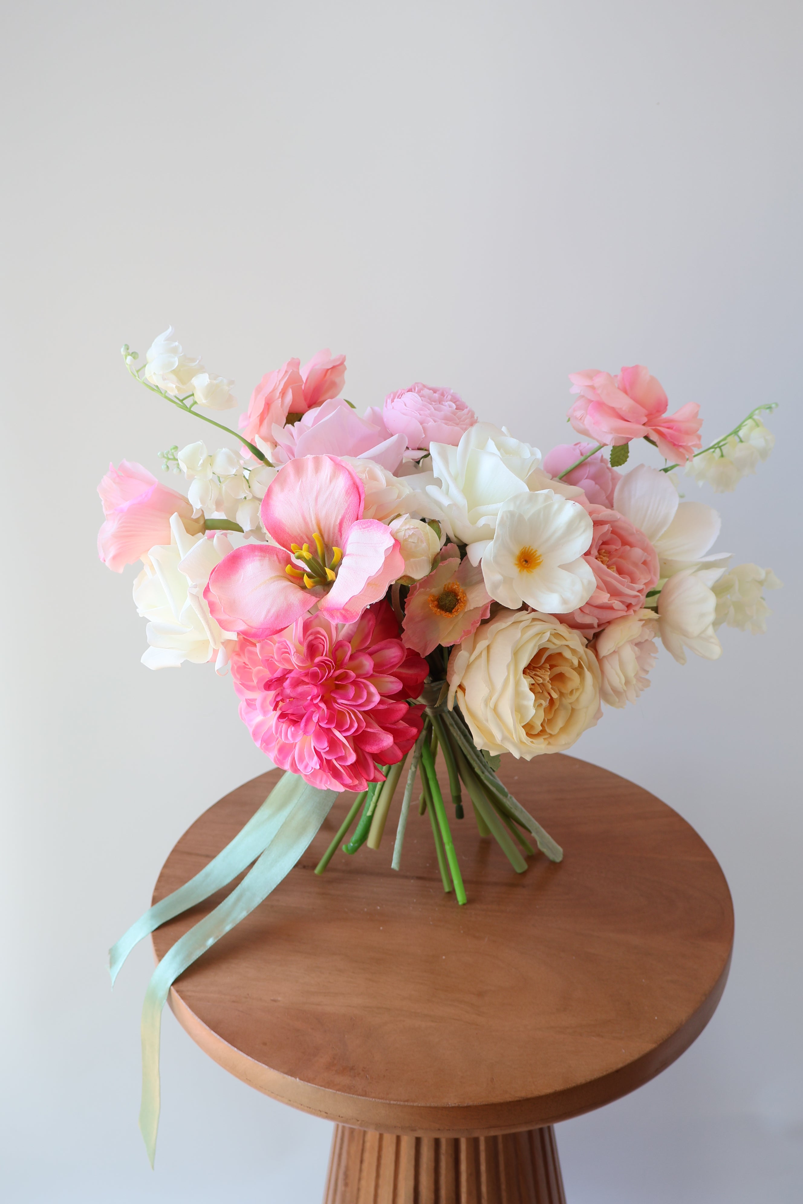 Trendy Bridesmaid basket bouquet with pastel flowers on a wooden stool against a white background