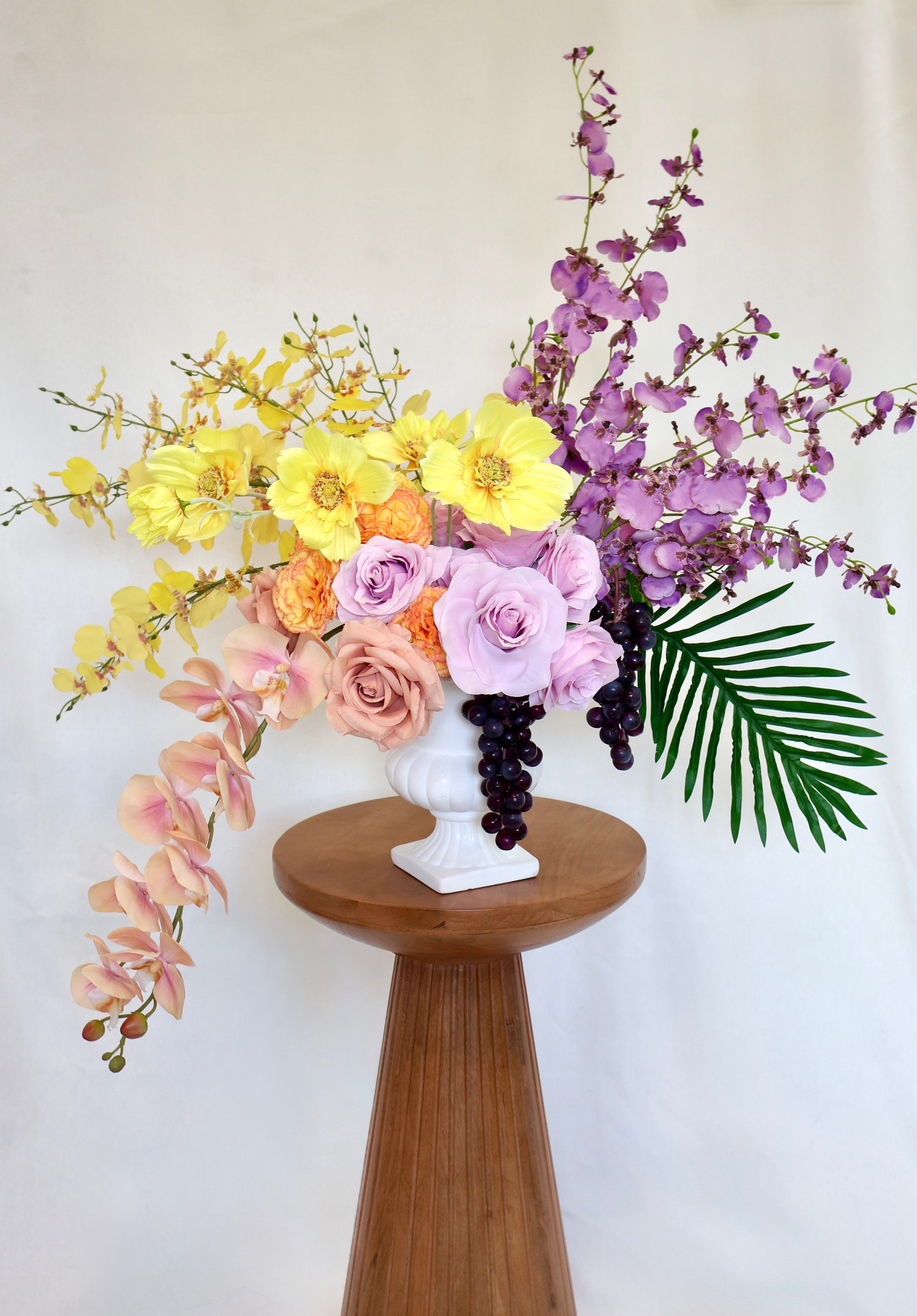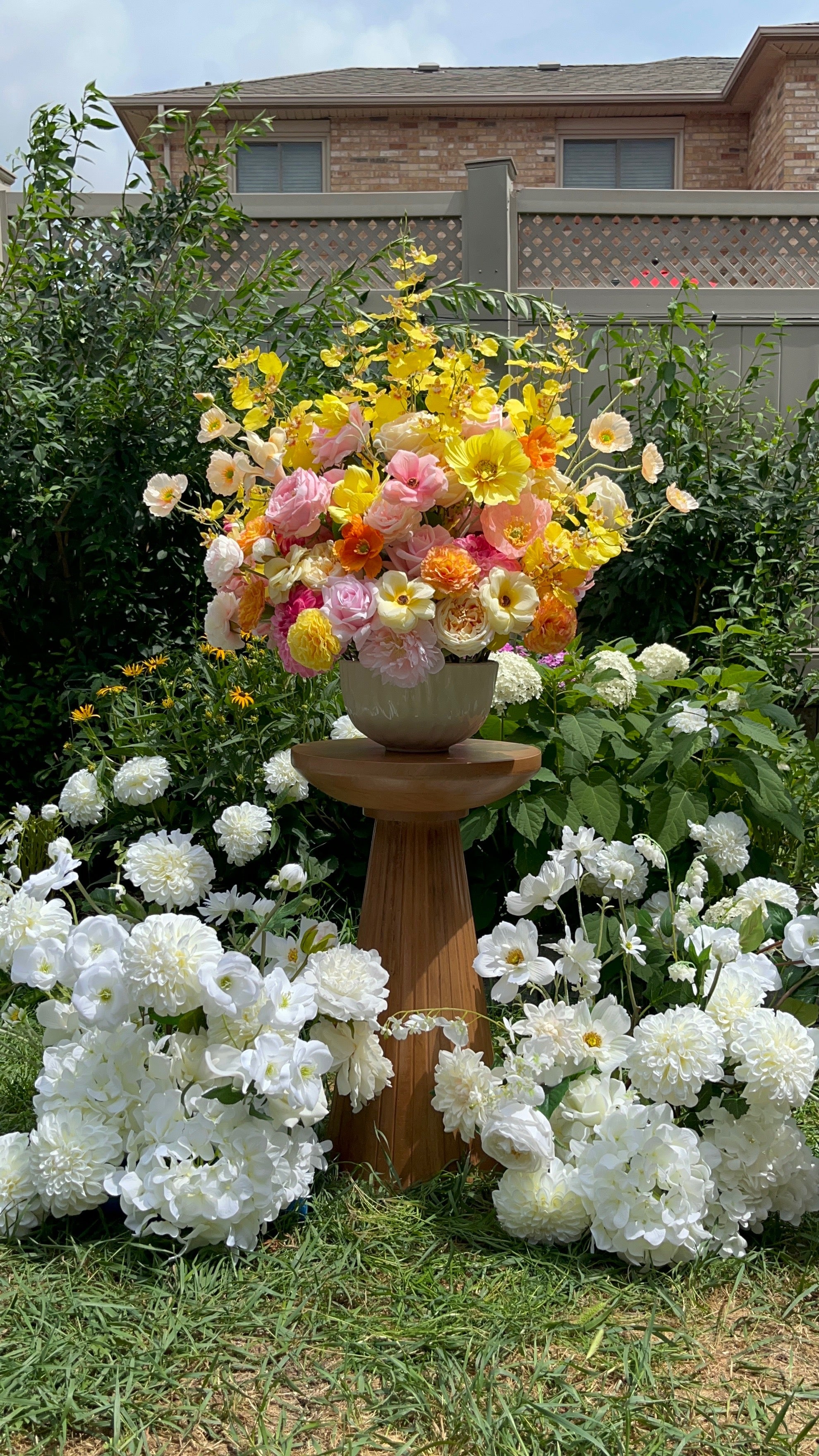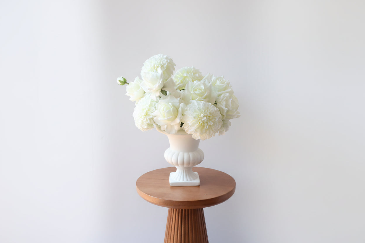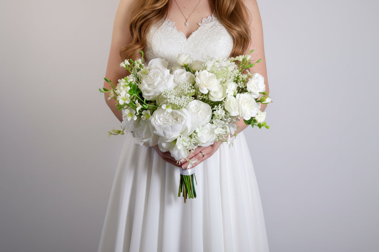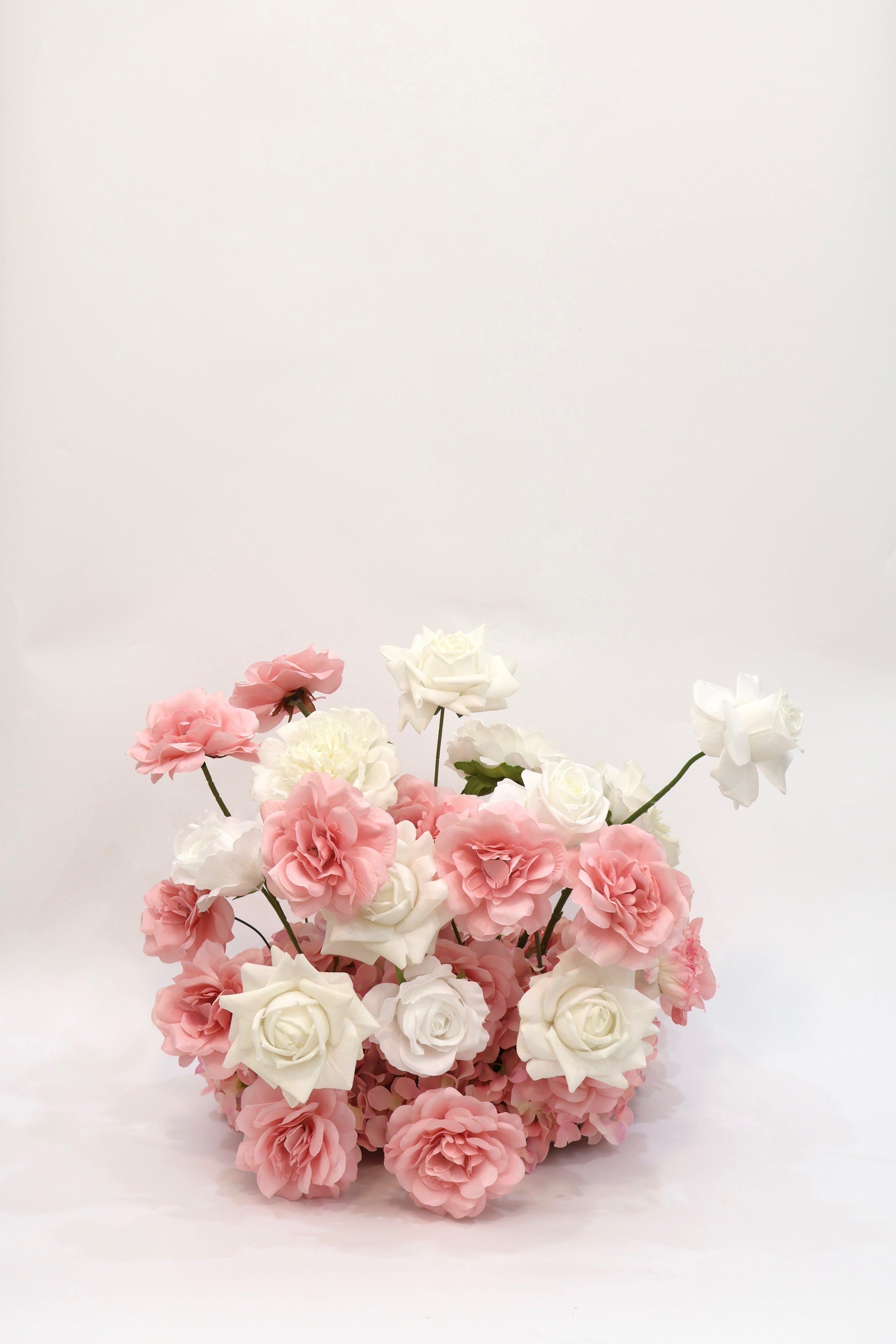 Trendy Bridesmaid basket bouquet with pastel flowers on a wooden stool against a white background
