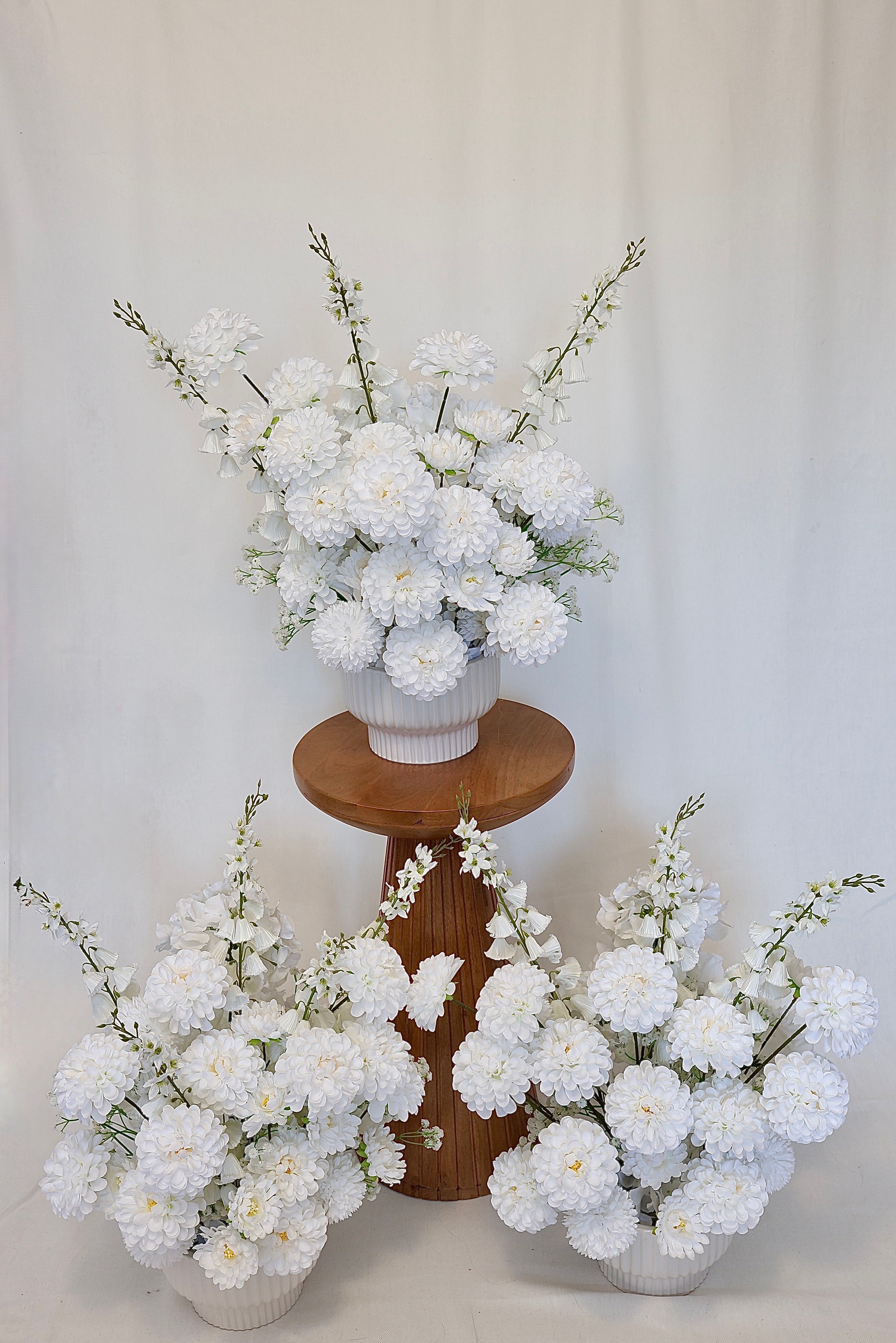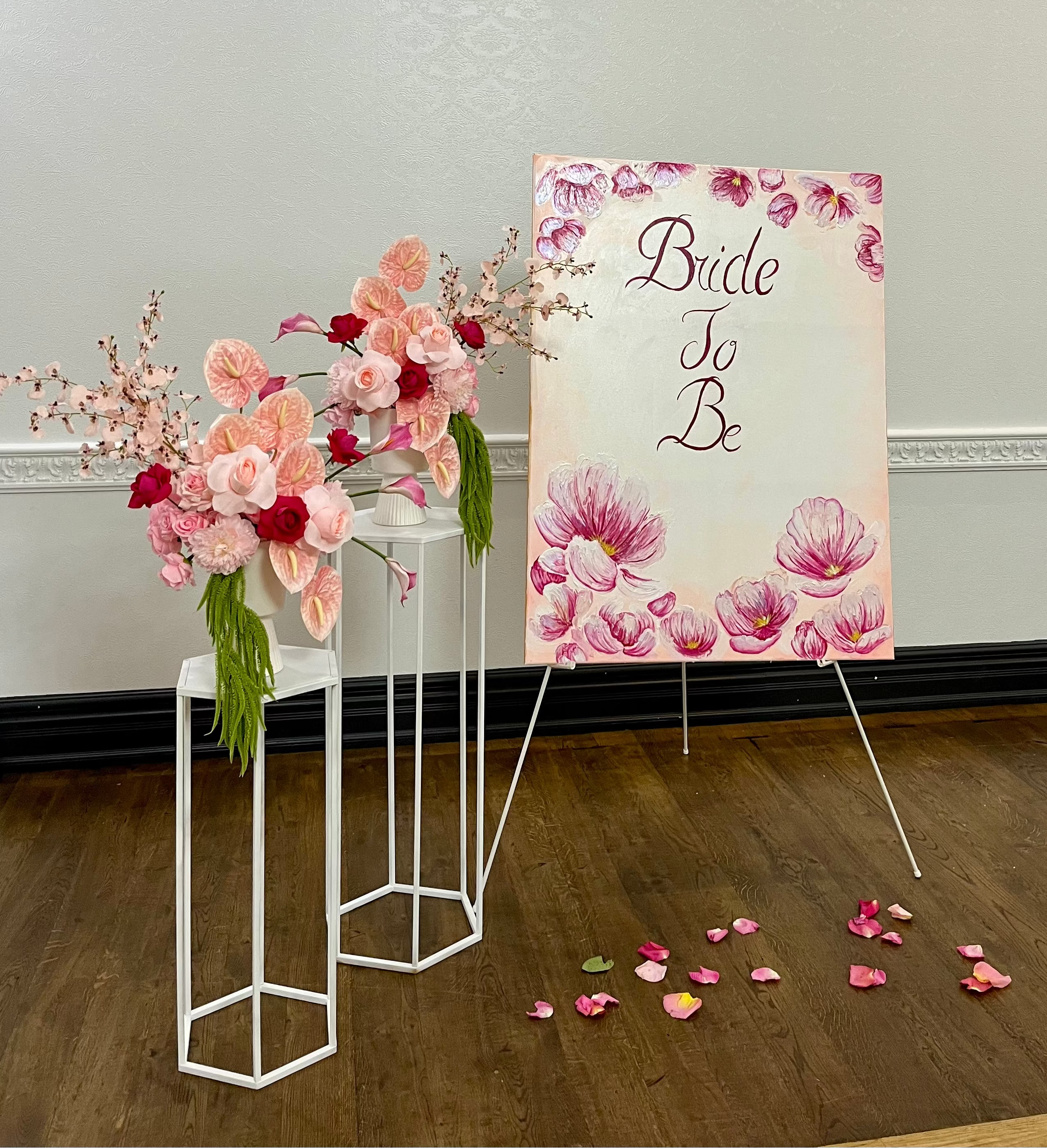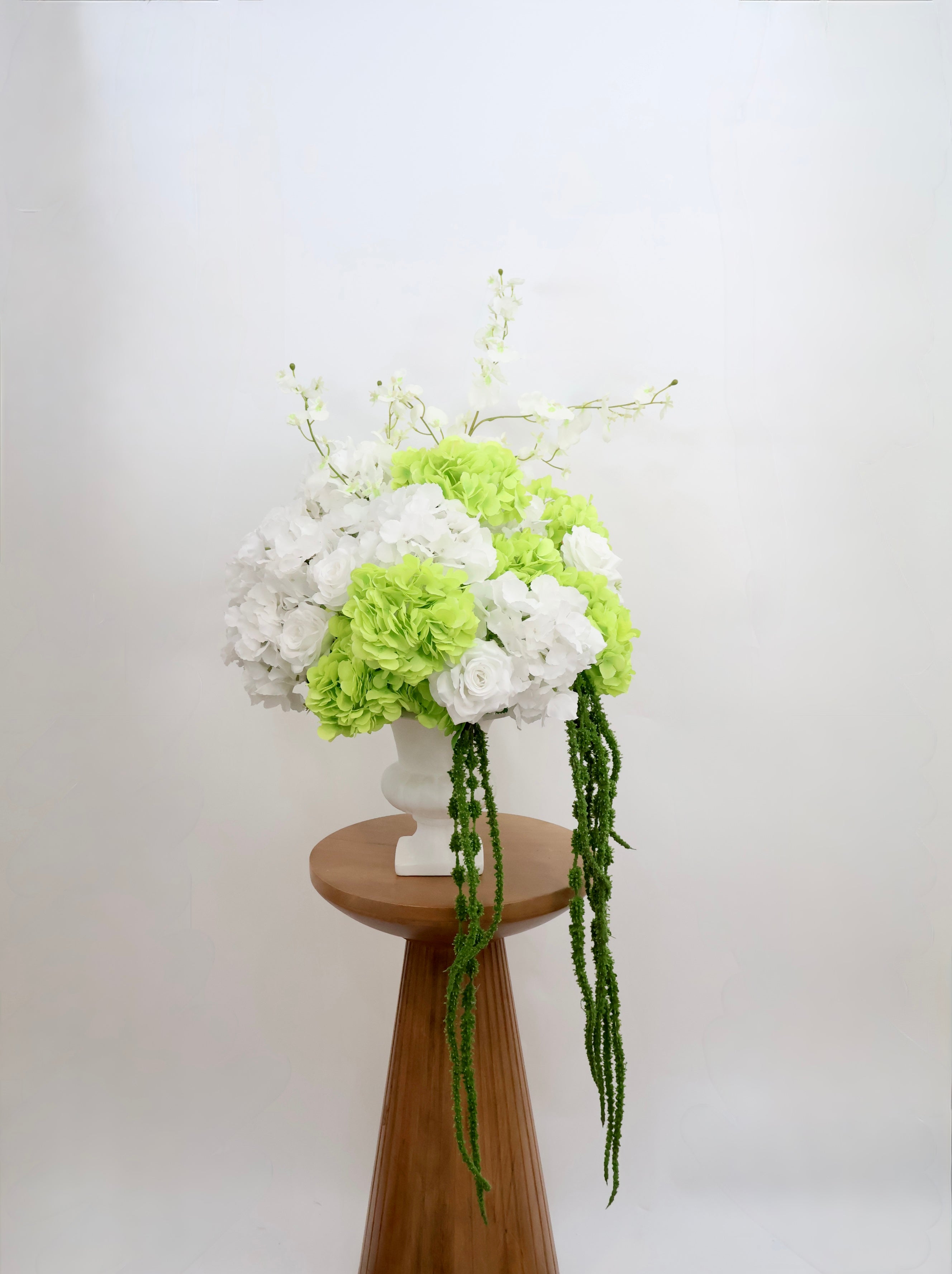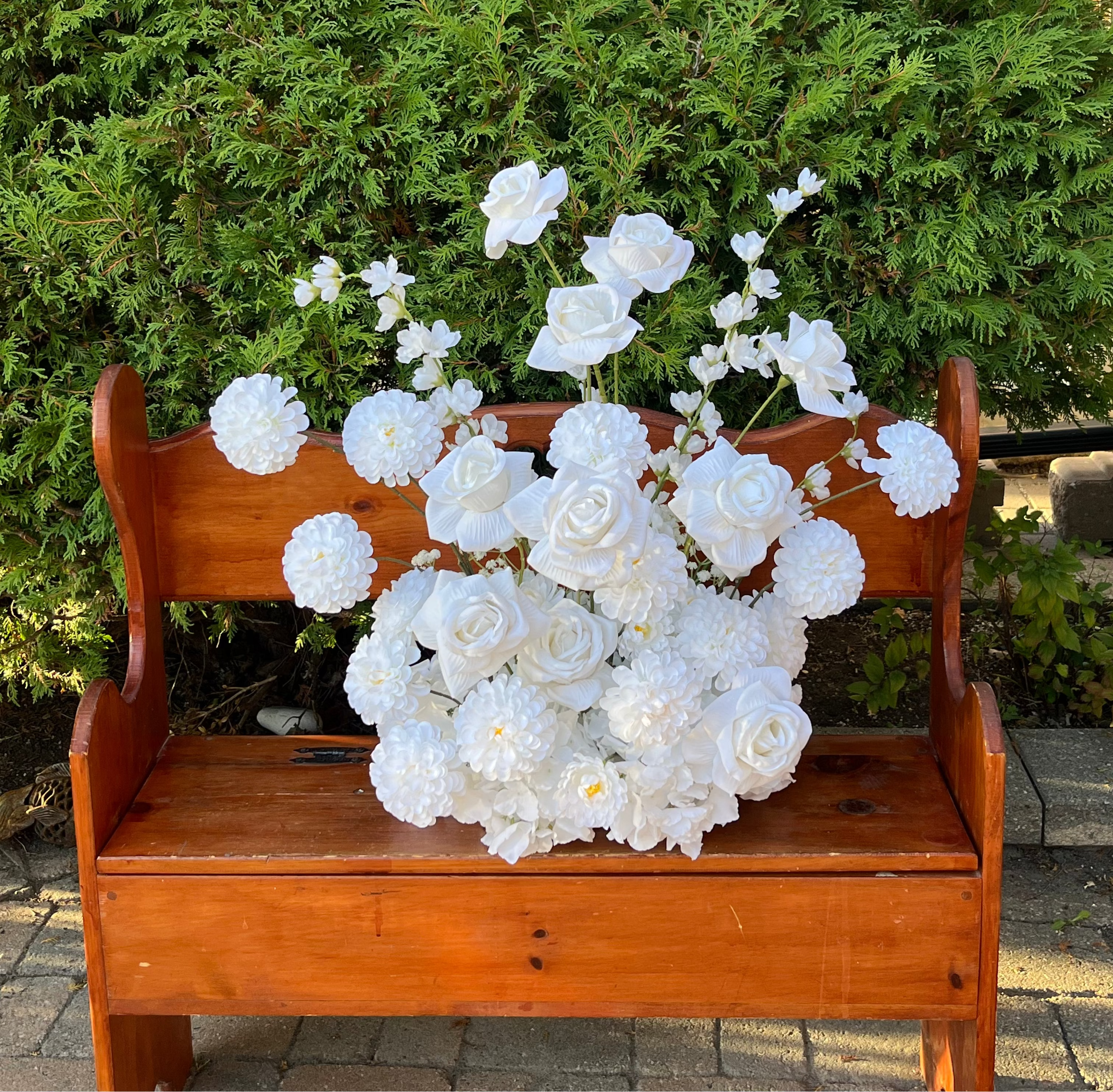 Trendy Bridesmaid basket bouquet with pastel flowers on a wooden stool against a white background