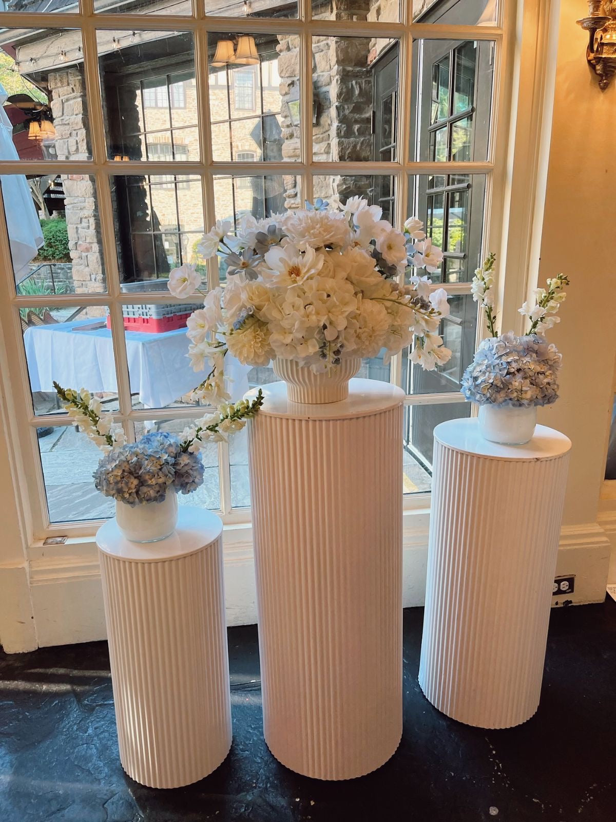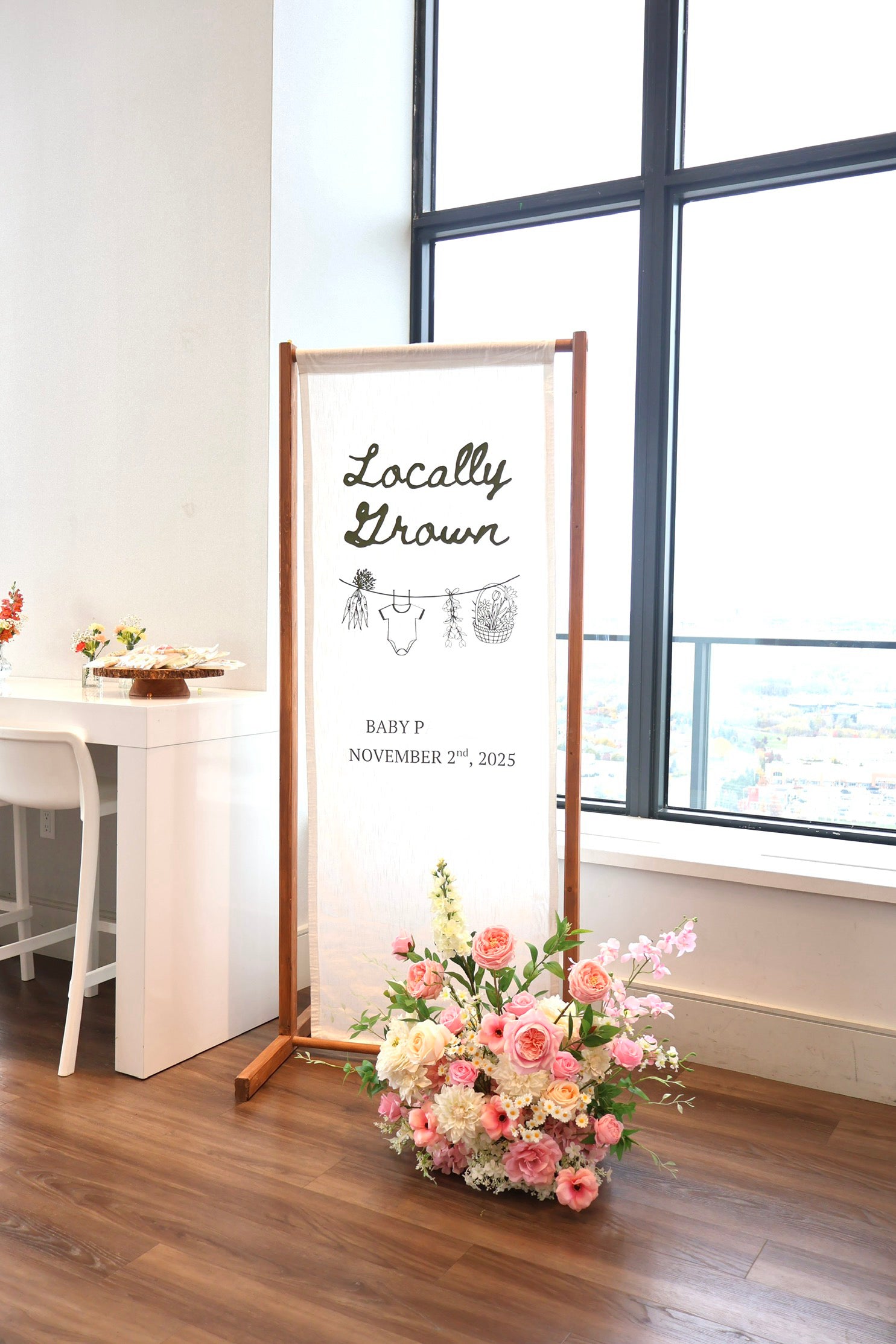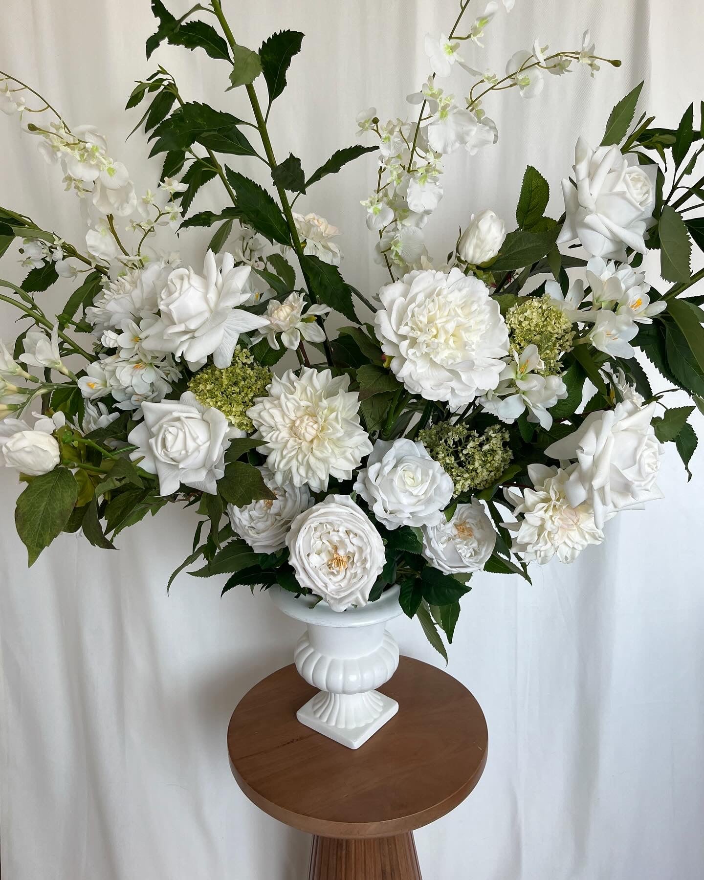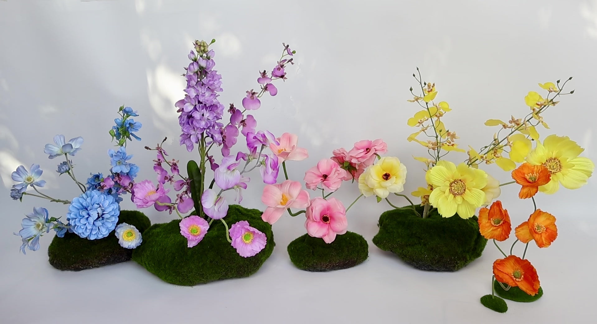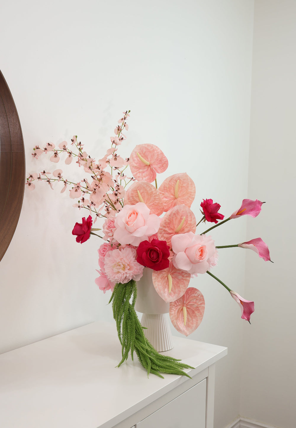 Trendy Bridesmaid basket bouquet with pastel flowers on a wooden stool against a white background