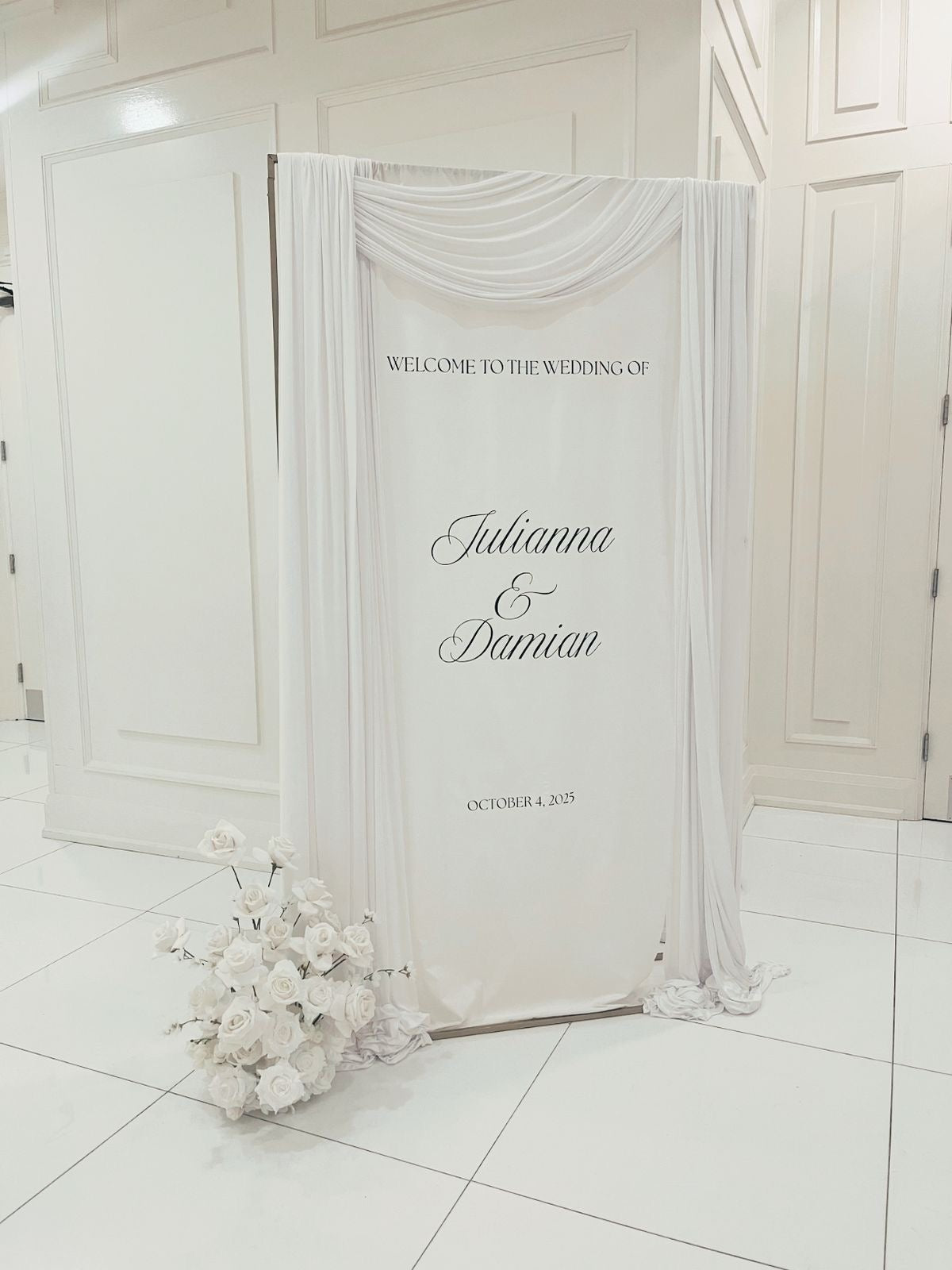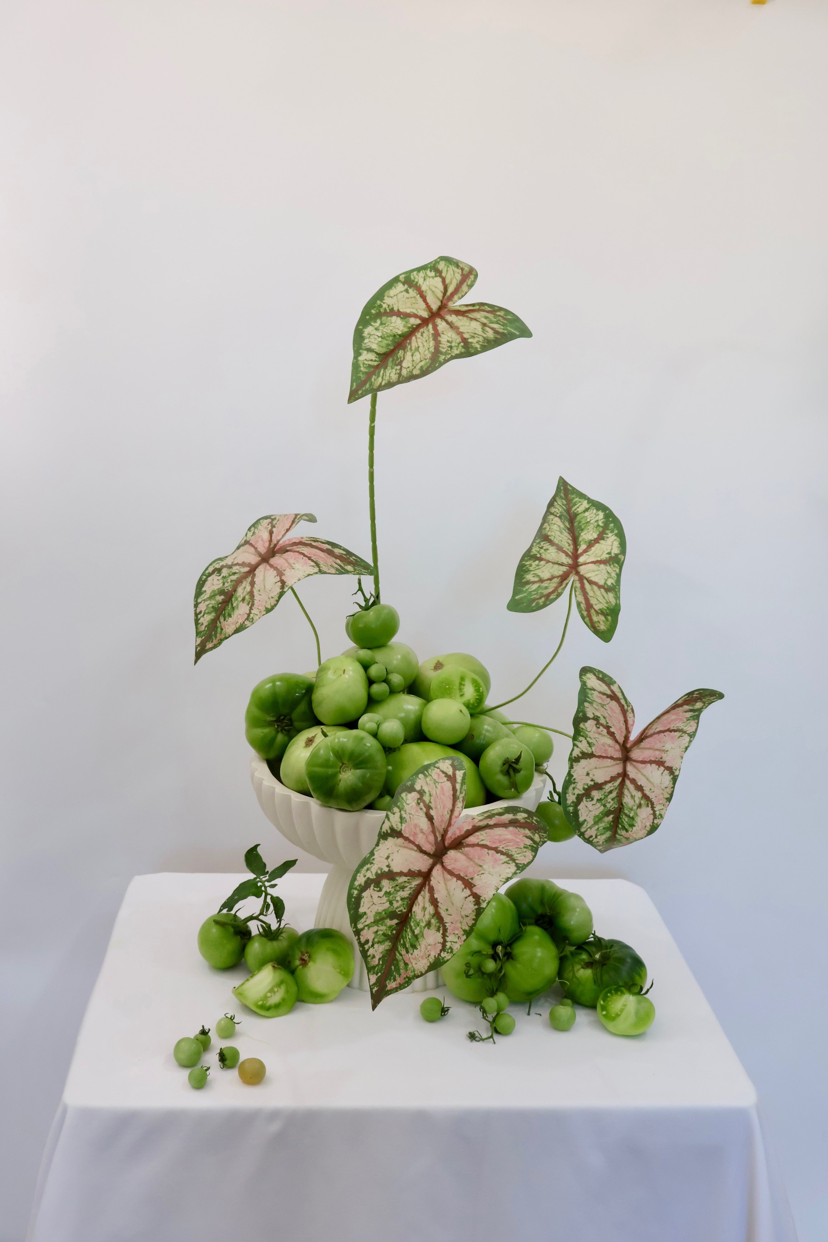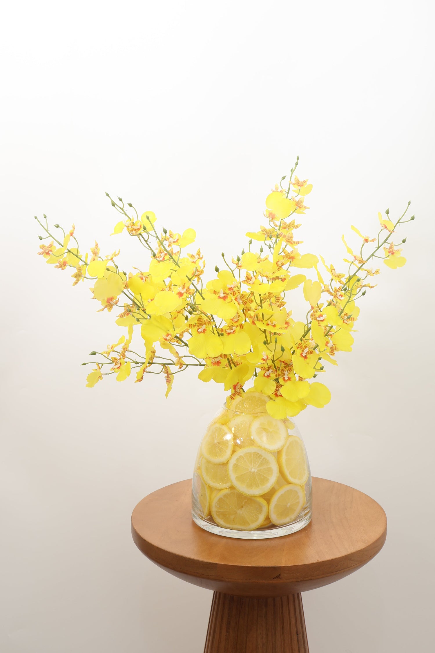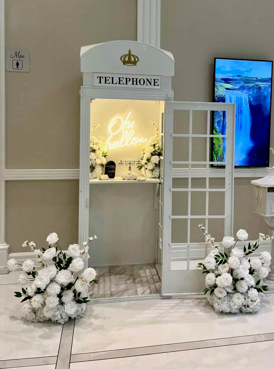 Trendy Bridesmaid basket bouquet with pastel flowers on a wooden stool against a white background